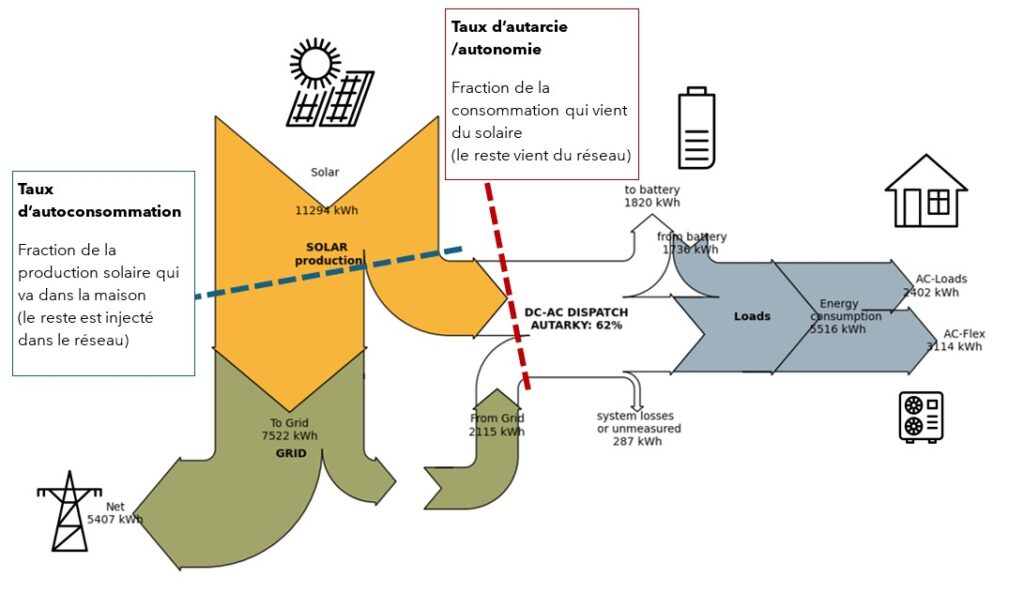 Ce n’est pas le bilan global de production qui est important pour le taux d’autarcie, mais bien l’utilisation réelle en directe dans le site. Si beaucoup d’énergie est revendue au réseau et rachetée plus tard, la maison n’est pas indépendante du réseau ; bien au contraire elle en est très dépendante.