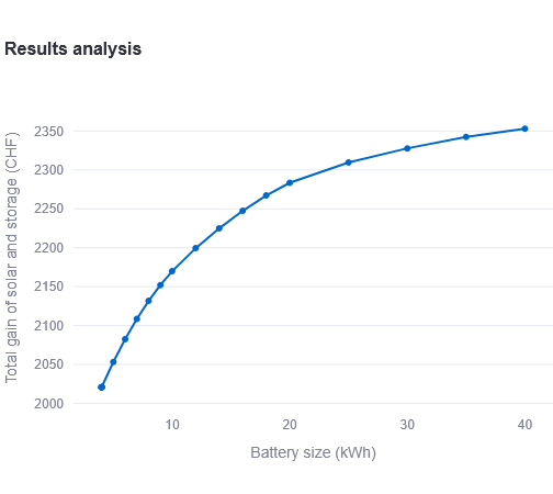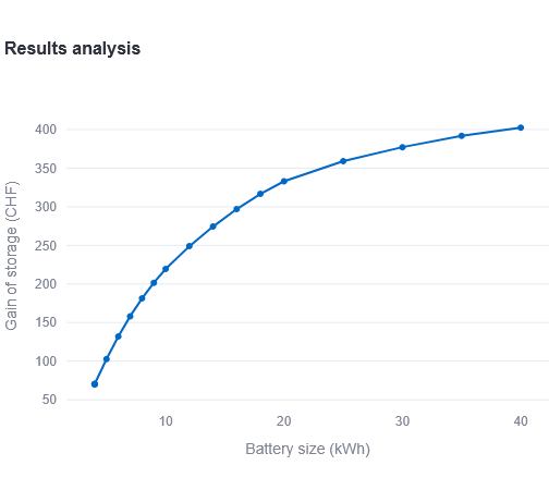 Voici donc la réponse à la question du titre de cet article: sur ce bâtiment particulier avec cette quantité de solaire installé, avec les prix de l’électricité de 2025, une batterie de 10kWh rapporte 220CHF par année et de 30 kWh rapporte 377CHF par année.